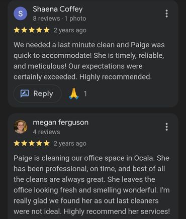 Life is busy, and I am passionate about easing the burdens of those around me. I started this cleaning business to provide top-notch residential cleaning services for those in need. It's a fact that a clean home produces positive energy. For me, life feels heavier when things aren't clean and orderly. Allow me to help keep your space clean with our various cleaning packages, including commercial cleaning options. Serving both Citrus and Marion County.